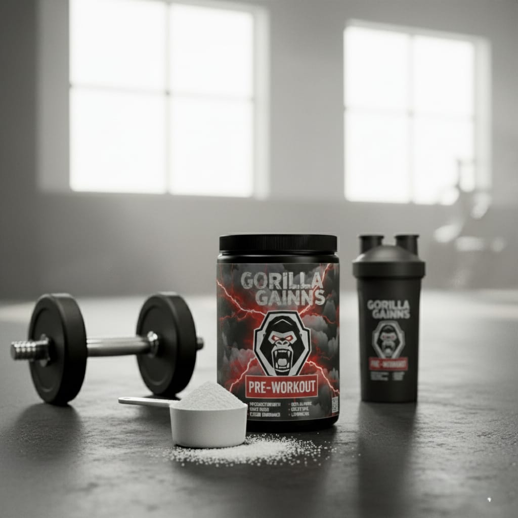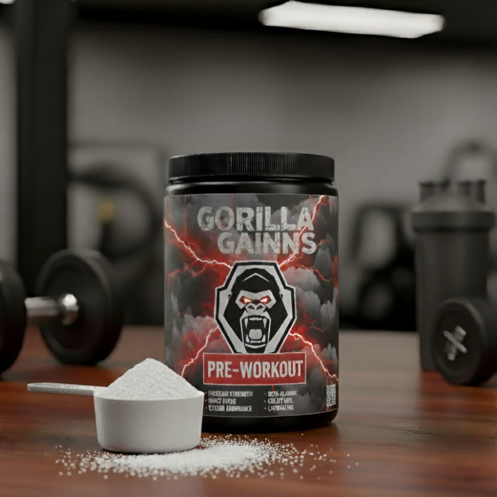 Ignite your workouts and unleash peak performance with Gorilla Gainns Pre-Workout — the energy your body needs, the power your training deserves.